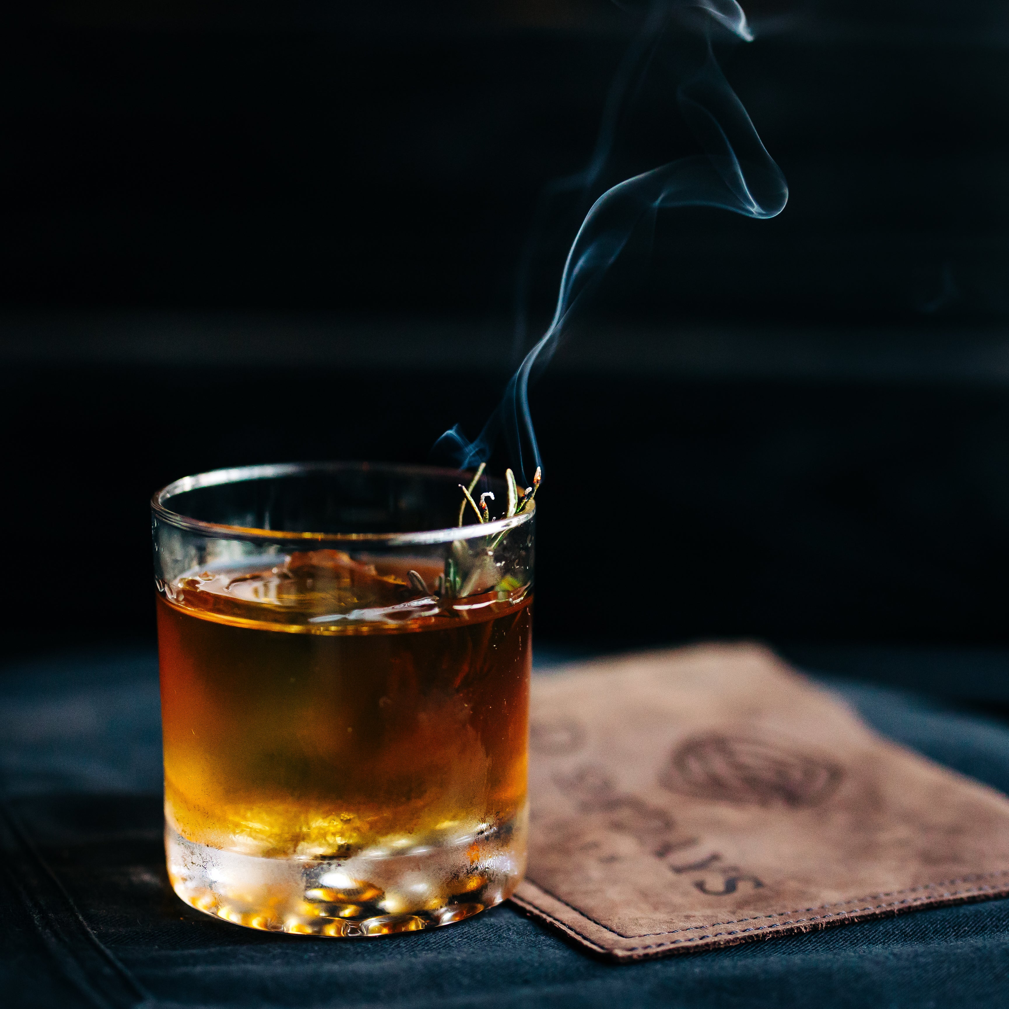 Combine all ingredients into a mixing glass, add ice, stir and strain into rocks glass. Mist with smoky scotch mist and garnish with smoked rosemary.